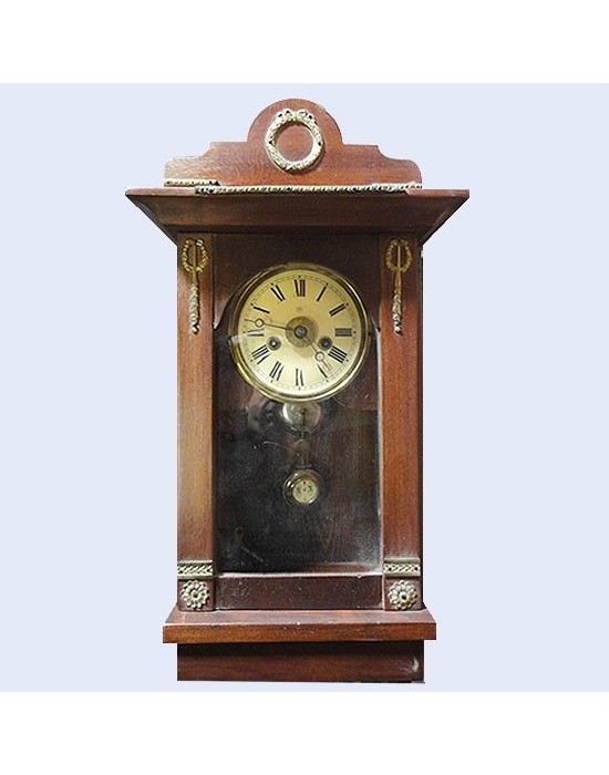 Caixa fabricada en fusta massissa tallada a mà. Rellotge de corda i pèndol, dóna les hores i les mitges hores. Té despertador, sense funcionar. Revisat i funcionant correctament.