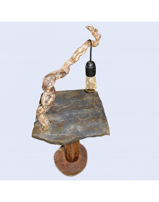 Mesita de noche con lámpara de cepa clavada en la parte superior. El pie de la mesita está hecho con un tronco de pino barnizado de tonalidad roble oscuro.La mesa está hecha con una piedra plana y con un barniz satinado.La lámpara es un tronco de cepa con una bombilla colgante estilo Edison Retro. El cable queda oculto en el interior del...