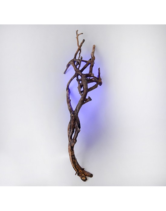 Aplique de pared hecho con un trozo de tronco de hiedra, extraída directamente del árbol donde estaba abrazada. En la parte interior incorpora una tira de leds RGB, que cambian de color utilizando un mando a distancia.