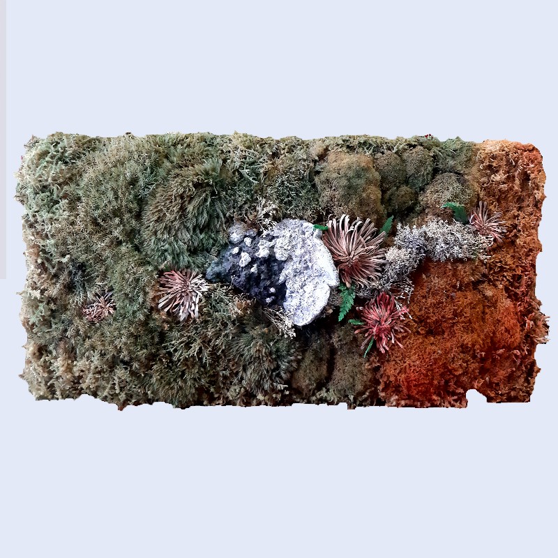 Jardín vertical con musgo, plantas, hojas y setas, todo natural y preservado.