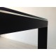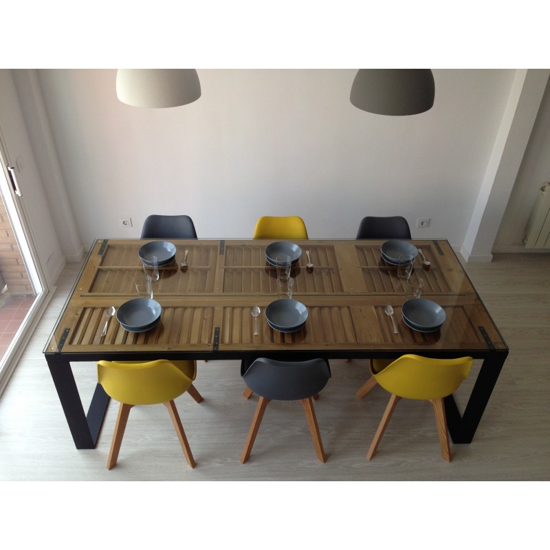 Los portones fueron decapados mediante inmersión en una piscina especial y pulidos posteriormente para que la madera quedase bien lisa y sin astillas. Unas patas y una estructura de hierro hecha a medida que enmarca la madera, son el complemento perfecto para que esta pieza sea ligera y tenga presencia a la vez. La superficie está protegida con un vidrio laminado con cantos romos.